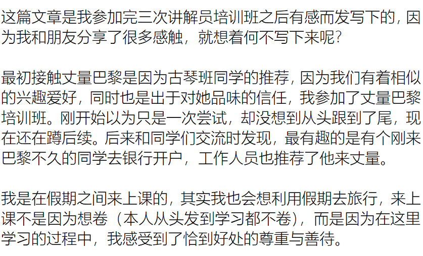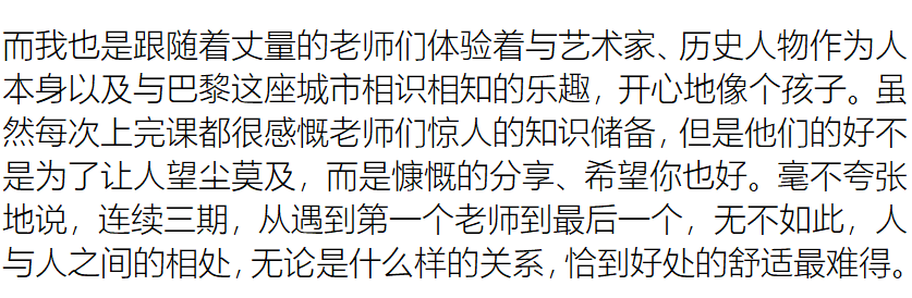"我也是跟随着丈量的老师们体验着与艺术家、历史人物作为人本身以及与巴黎这座城市相识相知的乐趣,开心地像个孩子。虽然每次上完课都很感慨老师们惊人的知识储备,但是他们的好不是为了让人望尘莫及,而是慷慨的分享、希望你也好..."
